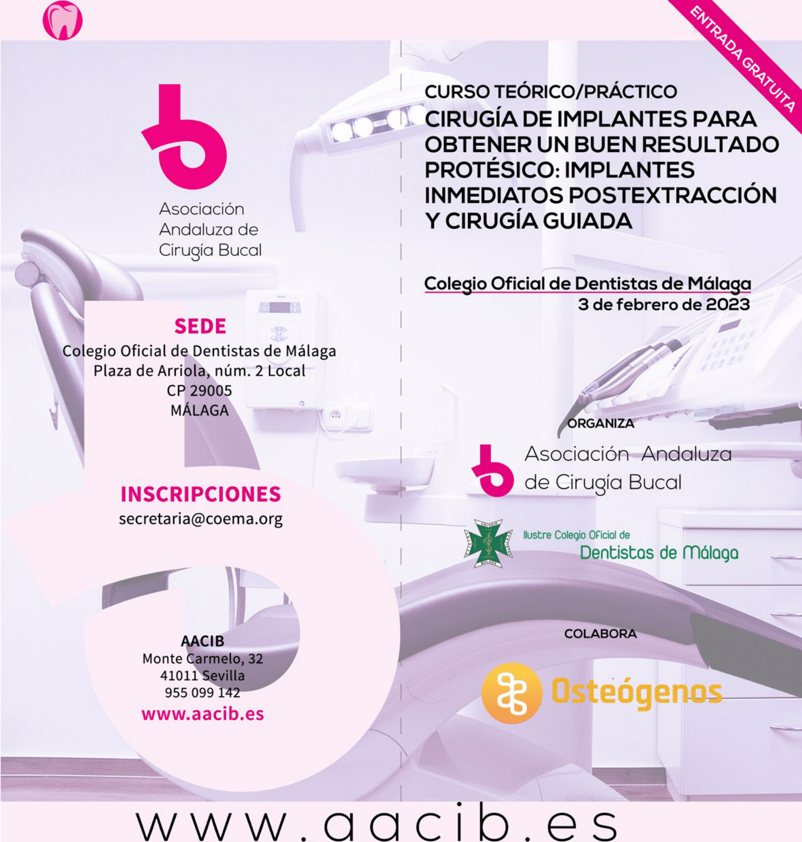 Ago82023CursoCursos OrganizadosNoticiasCelebrado en Málaga en febrero de 2023 ¡Comparte! Share on FacebookShare on Facebook TweetShare on Twitter Share on LinkedInShare on LinkedIn Share on WhatsAppShare on WhatsApp Más actualidadNueva Junta Directiva de la Asociación Andaluza de Cirugía Bucal (AACIB)12 noviembre, 2025Curso Cirugía de implantes para obtener un buen resultado protésico: implantes inmediatos postextracción y cirugía guiada28 octubre, 2025Granada acogerá el VII Congreso de la AACIB13 junio, 2025BTI Biotechnology recibe a alumnos y profesores del Máster de Cirugía Bucal Avanzada de la Universidad de Sevilla24 abril, 2025