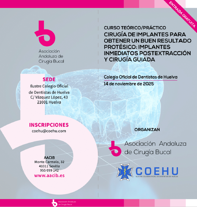 El próximo 14 de noviembre de 2025, el Ilustre Colegio Oficial de Dentistas de Huelva acogerá el curso teórico-práctico “Cirugía de implantes para obtener un buen resultado protésico: implantes inmediatos postextracción y cirugía guiada”, donde los doctores Francisco Javier Manzano Moreno y Francisco Javier Herrera Briones mostrarán las técnicas más actuales para lograr resultados estéticos predecibles mediante implantología inmediata y cirugía guiada, abordando diferentes situaciones clínicas con soporte bibliográfico. Una formación gratuita organizada por la Asociación Andaluza de Cirugía Bucal y el COEHU, dirigida a profesionales que buscan actualizar sus conocimientos en implantología con expertos de referencia.